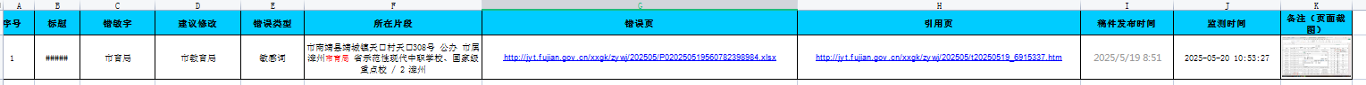 服务开始后,对网站历史存量信息包括附件等内容进行检测。发现问题及时发送检测结果,完成后形成检查报告(至少包含序号、标题、错敏字、建议修改、错误类型、所在片段、错误页、引用页、稿件发布时间、巡查时间、备注(页面截图)等信息。错误信息报告内容示意如下: