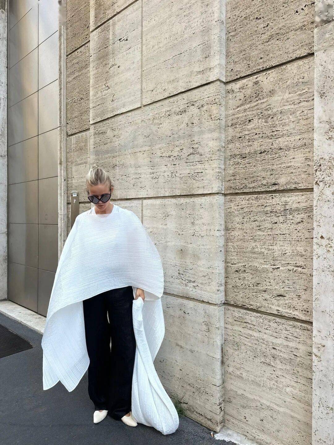 披风类单品堪称该风格标志,在 Ins 上出镜率极高。Beatrice Gutu 可谓“万物皆可披风”,而 Annemiek Kessels 则偏好将其与西装裤或直筒裙搭配,保持利落之余更添柔和。她对飘逸披风与飘带单品尤为青睐,收集众多心仪款式,每一件皆易搭配,比基础款独特,较设计款实穿。