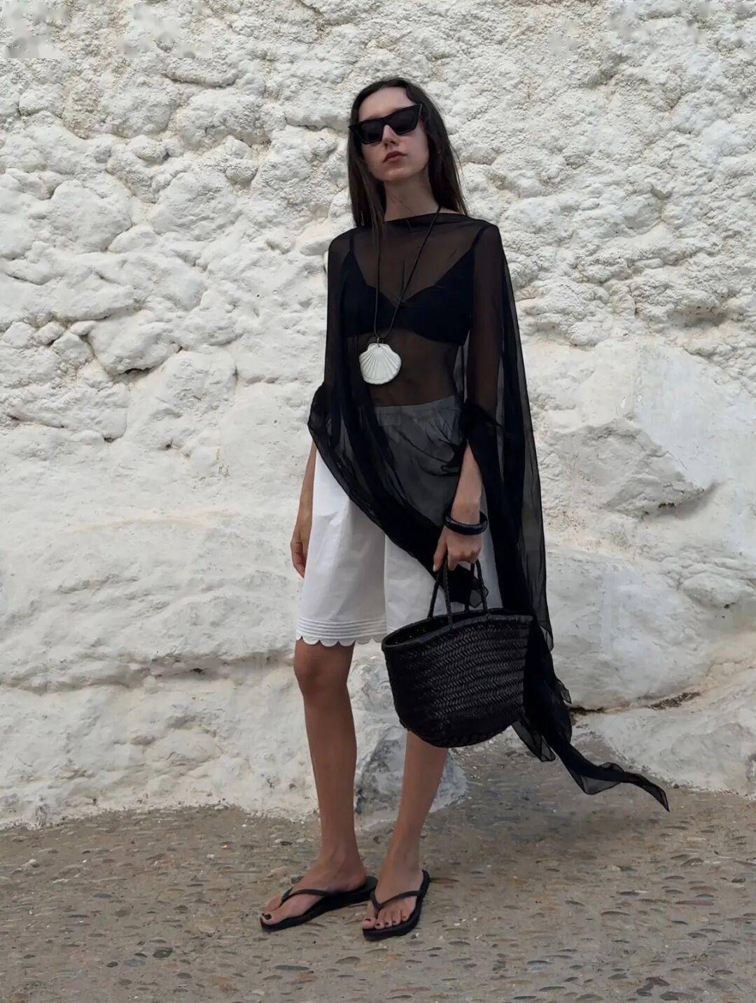 立体皱褶如古希腊雕塑般经典,轻盈薄纱披风带来飘逸仙气,配合流畅剪裁与优质面料,即便是中性色调也能摇曳生姿。这种轻松而高级的优雅,正是当下 Clean Fit、知识分子风、老钱风竭力诠释的核心,而艺术系贵妇们却举重若轻,将其穿得自然天成。