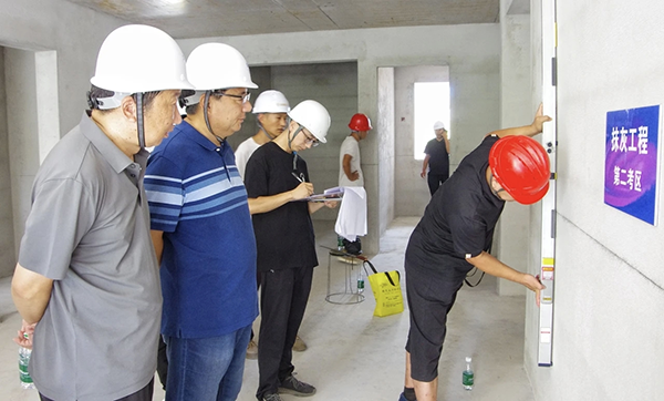 笔试现场,选手们凝神静思,沉着应答,考题涵盖建筑法规、材料标准、验收流程及质量规范等核心知识,尽显扎实理论功底。实操环节紧张激烈,水平尺的精准调校、回弹仪的沉稳操作、塞尺的细致探查……选手们在模拟工地上专注比拼,一丝不苟校验墙体垂直度、砌体的平整度、混凝土强度等关键指标,将“工匠精神”融入每一个操作细节。