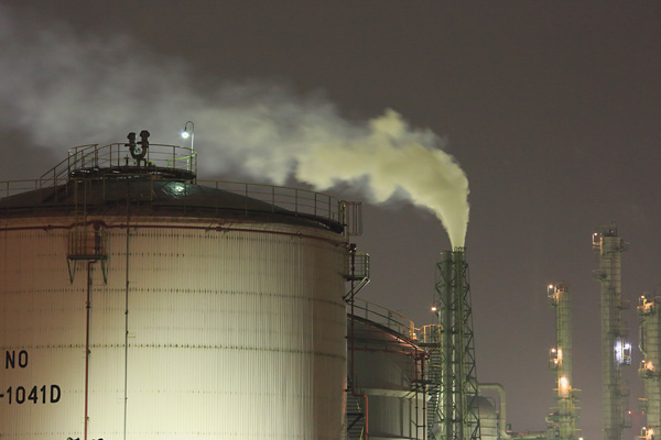 晚上仍在继续工作的现代不夜城。用平时的拍摄方法一直以来只能拍成动态模糊的烟雾,因为高感光度获得了更高快门速度,定格了画面。