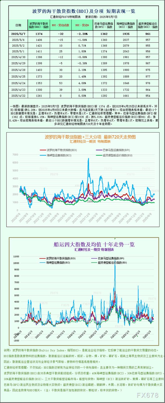 汇通财经APP讯——最新数据显示,2025年5月7日 波罗的海干散货指数(BDI)报 1374 点,创2025年4月25日以来新低水平,环比(较前值)跌2.28%,创2025年4月9日以来最大跌幅,且为连续第2天下跌(含0增长)。综合短期表格来看,最近11个BDI数据增长情况是:正增长6次,负增长4次,零增长是1次。其中,巴拿马型运费指数(BPI)报1362 点,较前值涨0.15%,海岬型运费指数(BCI)报1935 点,跌5.01%,超灵便型船运价指数(BSI)报961 点,涨0.42%。波罗的海干散货指数+三大分项的最新720天走势图、十年走势图等详见汇通财经特制图表。