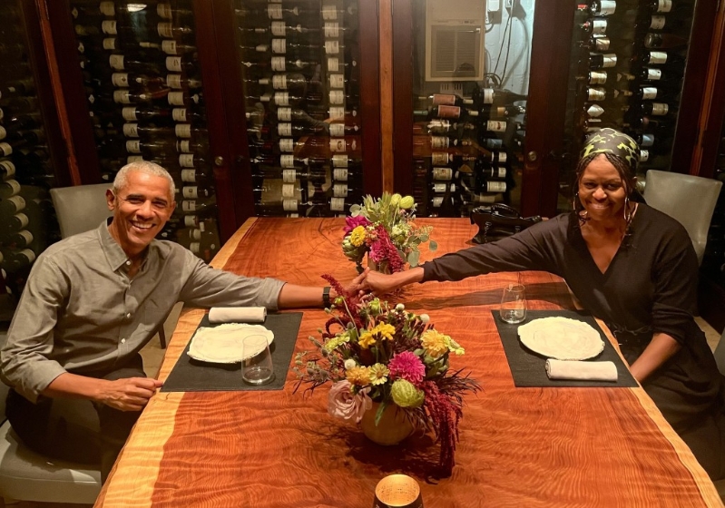照片中,2人共进晚餐,可见奥巴马穿着灰衬衫与黑西裤,微笑地坐在米歇尔对面,而米歇尔则穿着深色V领针织连衫裙。他们牵着手,望着镜头。