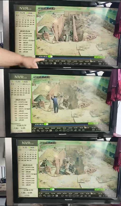 红星新闻记者获得了事发时的监控视频。视频显示,当天17点01分,共有4名工人在已经挖好的坑底砌墙施工,墙外和坑边缘还有很大空间;17点02分,一辆推土车将一铲车土料堆放在墙外,之后又推着土料向前开了几米,墙体突然坍塌。